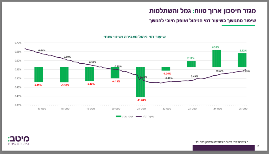 בתחום חיסכון ארוך הטווח המעמד של מיטב כמגייסת מהשלישייה הפותחת ותשואות גבוהות מאוד בשוק ההון הובילו לצמיחה חסרת תקדים בנכסים המנוהלים, בהכנסות ורווחיות המגזר הזה. כנראה פעילות החיסכון ארוך טווח של מיטב היא אחת מהטובות והמאוזנת בענף, הן מצד ניהול ההשקעות, חדשנות המוצרים, שיווק, הפצה וכו'. כל זה מאפשר לחברה להמשיך לצמוח ולגדול על אף שה-CAC שלה (וצריך להגיד גם של בתי השקעות אחרים) נמוך משמעותית משל חברות הביטוח, ביחד עם שליטה בצד ההוצאות, אוטומציה משמעותית, הדבר מוביל למנוף תפעולי משמעותי. זאת נקודה קריטית כי היא משפיעה על היכולת להוריד הרבה יותר מכל שקל שולי לשורה התחתונה ואנחנו ממש רואים את זה בשנתיים האחרונות. דבר נוסף הוא מגמת השיפור בדמי ניהול הממוצעים שממשיכה ויש עוד מקום לשיפור ביחס לענף וזה כשלעצמו מעבר לצמיחה הטבעית יכול להוביל לעוד קפיצה ברווחים בשנתיים הקרובות.