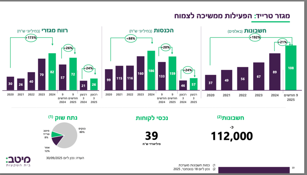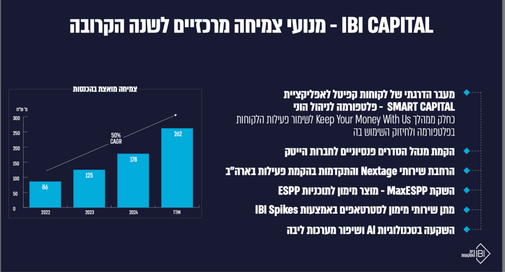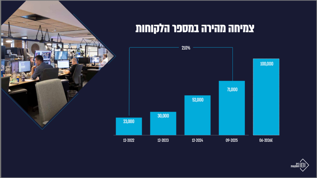 - חבר הבורסה ללקוחות ריטייל: בסוף שנת 2024 החברה שמה לה ליעד להגיע ל-100 אלף לקוחות תוך שנה וחצי, באותו זמן לחברה היו 52 אלף לקוחות.