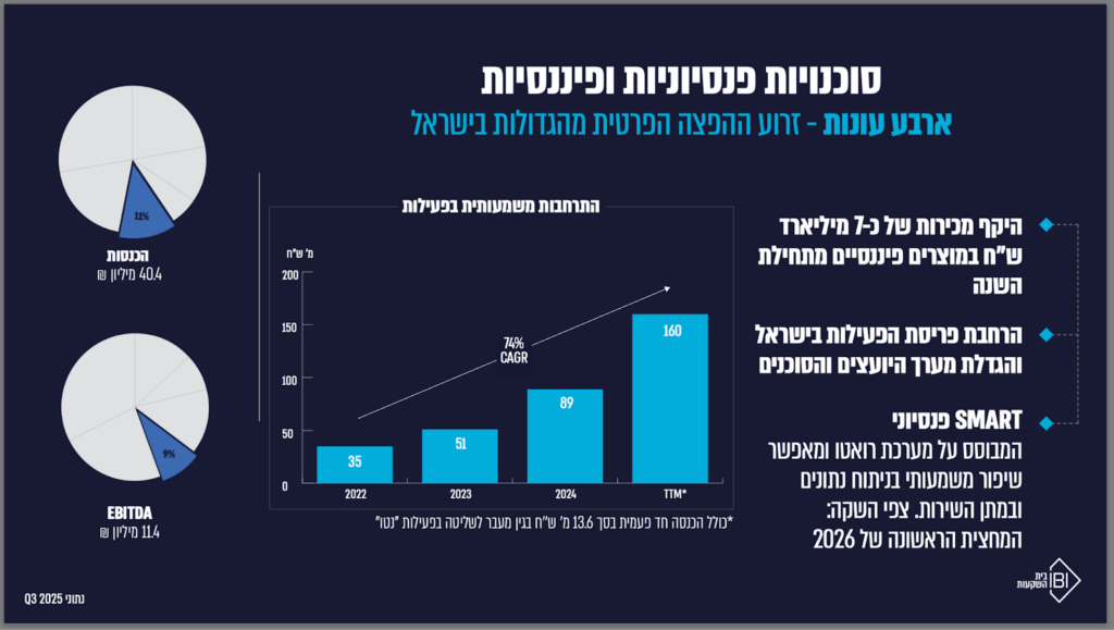 ארבע עונות השלימה בתחילת שנה את הרכישה של פעילות נטו, קלטה את רוב הסוכנים שהיו שם והפכה לאחת משתי בתי הסוכן הגדולים בישראל. הייתה עבודה משמעותית שנעשתה בחברה השנה מחברה עם סניף 1 מרכזי בתל אביב לחברה עם 4 סניפים, מינוי מנהלי סניפים, הרחבה של השדרה הניהולית בשביל לתמוך בסקייל ובגידול בפעילות. אחרי מספר רבעונים מאתגרים שהתחילו בבלאגן המשפטי שנטו נכנסה אליו עם חדלות פירעון ואז השלמת הרכישה, אנחנו כבר רואים החל מהרבעון השני חברה אחרת לגמרי: קצבי מכירה משמעותיים ומרשימים, מנוף תפעולי וקצב הכנסות שכבר עובר את ה-160 מיליון ש״ח (מדהים לזכור שזאת חברה שב-2022 הכניסה 35 מיליון ש״ח בשנה, עם מרווח EBITDA של 28%). אני חושב שמפה החברה תדע לתמוך בגידול משמעותי גם בהיקף הפעילות, גם בהיקף הסוכנים בלי גידול משמעותי במטה שיודע לתמוך בזה, ורוב הגידול (בהתחשב כמובן בחלק של ההוצאות המשתנות) ירד לשורה התחתונה, לכן לדעתי בעתיד עם הסקייל יהיה עוד מקום לשיפור במרווח, במיוחד אם החברה תפתח גם זרוע ישירה אחרי העליה של הפעילות הפנסיונית ל-IBI SMART. בנוסף הגודל של החברה עוזר לקבוצה עם כוח התמחור וההסכמים מהטובים בשוק להקים את סוכנות ההסדר הפנסיונית אשר נשענת על ההסכמים של ארבע העונות.