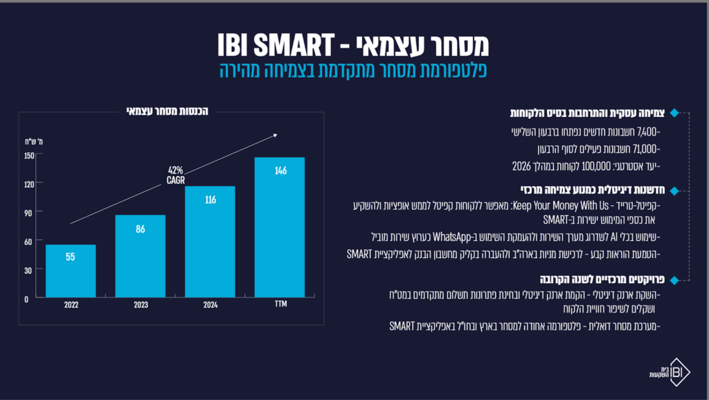 ניתן לראות שהמספרים מרשימים מאוד בנתוני החברה, עם קצב צמיחה שנתי ממוצע של 42% בהכנסות החברה מאז שנת 2022. המסחר העצמאי הוא בעצם מנוע צמיחה משמעותי לפעילות החברה וסינרגיה בין השירותים השונים שלה. בגדול עם השקת IBI SMART החברה שמה לה ליעד לרכז חלק מהותי מפעילות הריטייל שלה תחת הפלטפורמה הזאת. מה זה בעצם אומר?